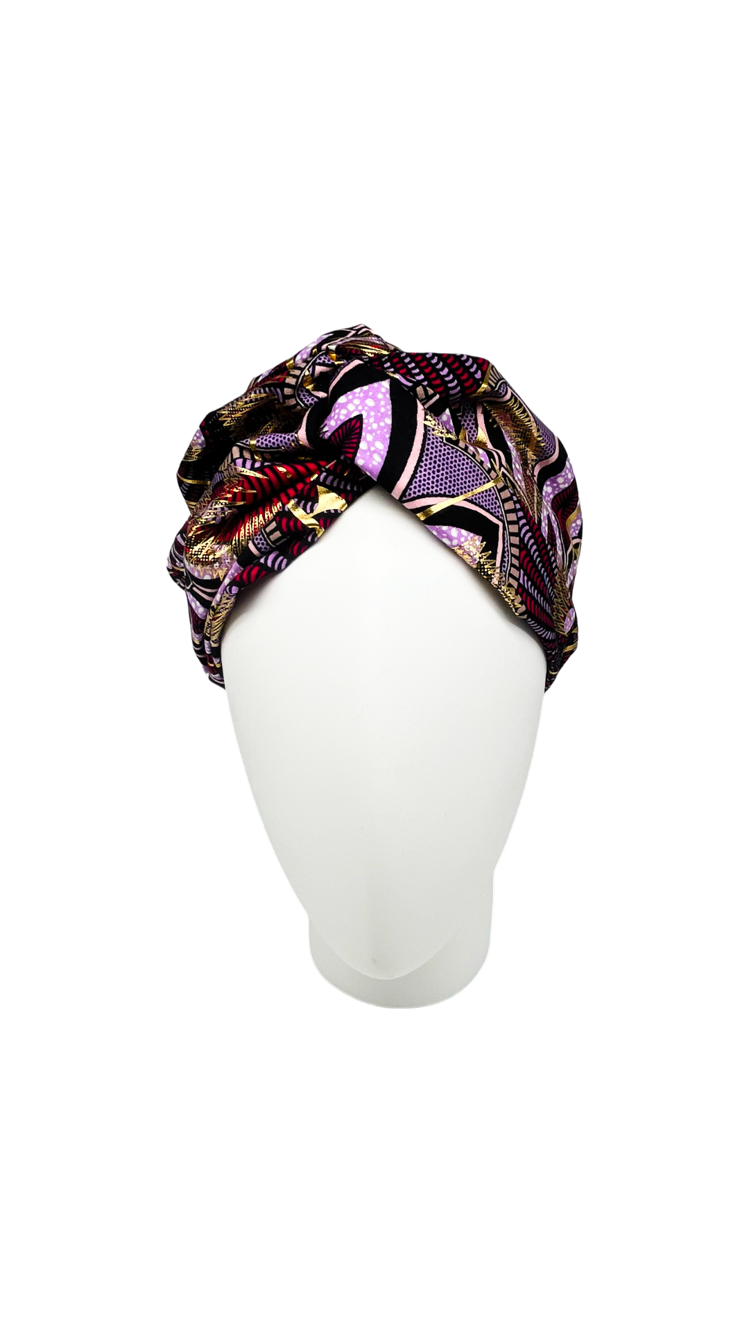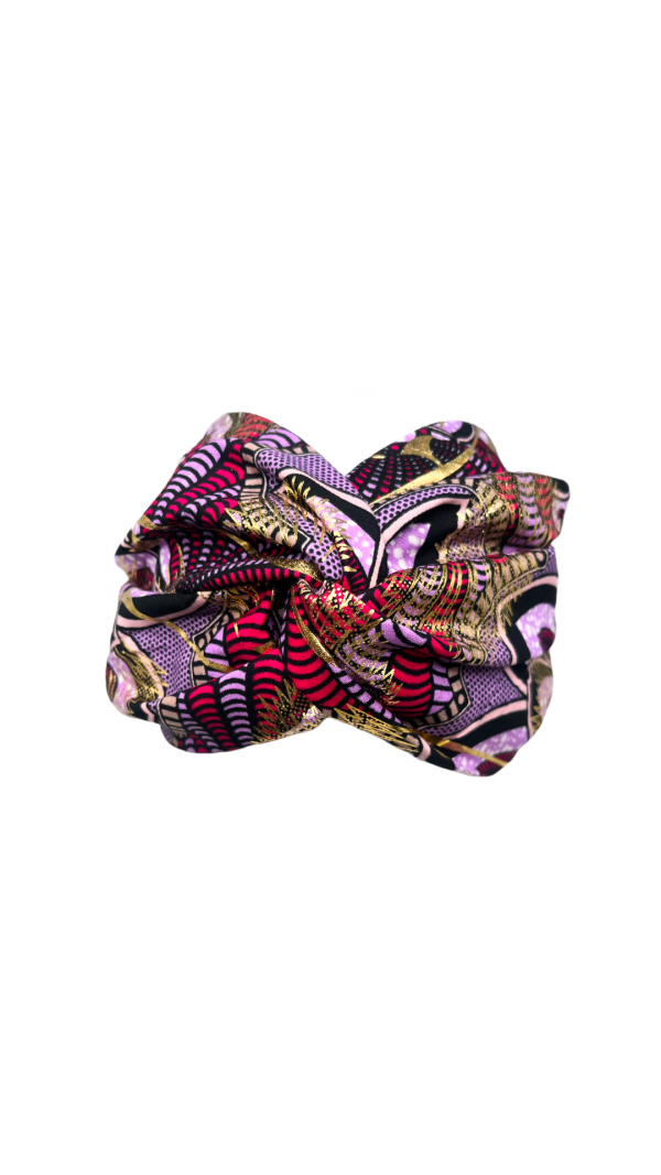 Tejido waxprint de colores malvas y toques dorados, elegante y sofisticado.