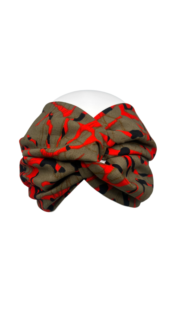 Tejido waxprint con toques rojizos y veres detalles negro, un efecto camuflaje.