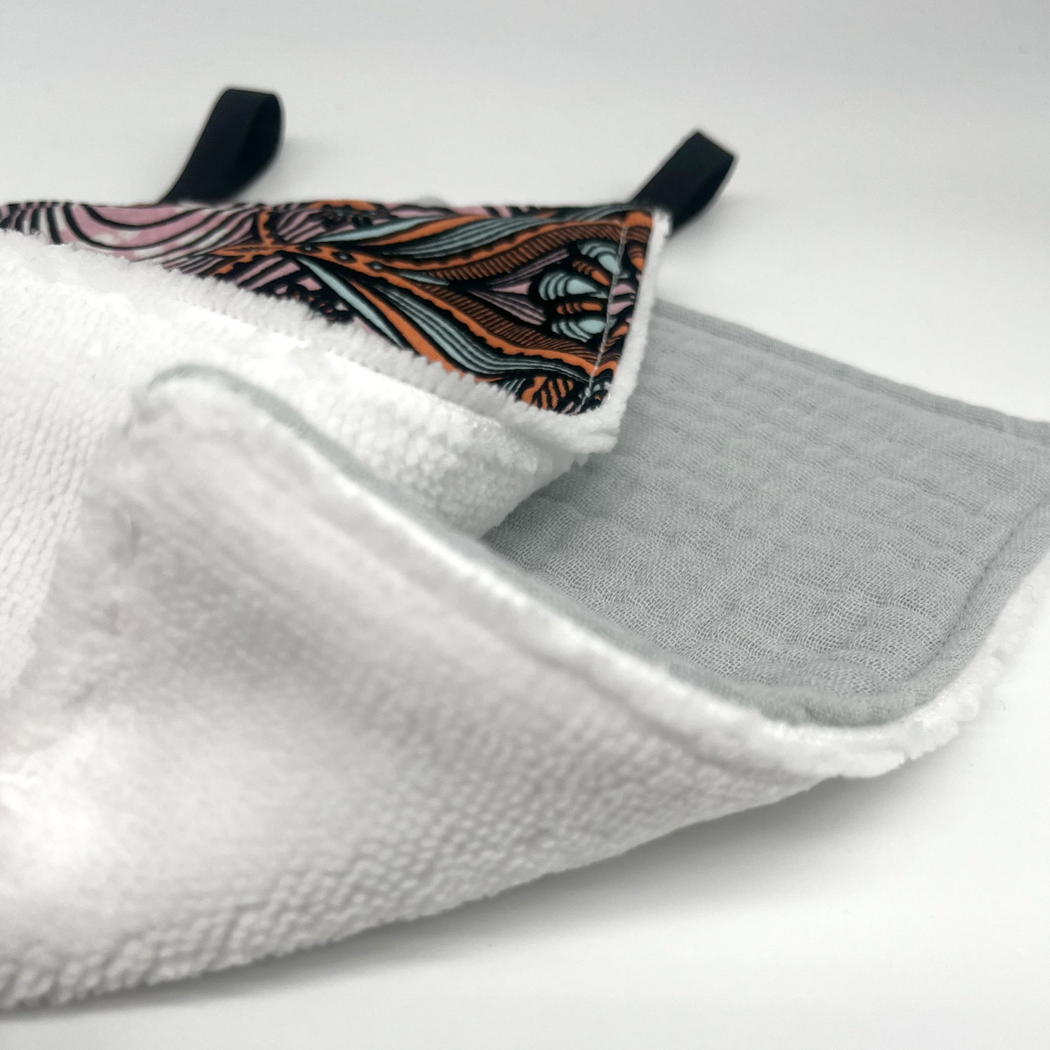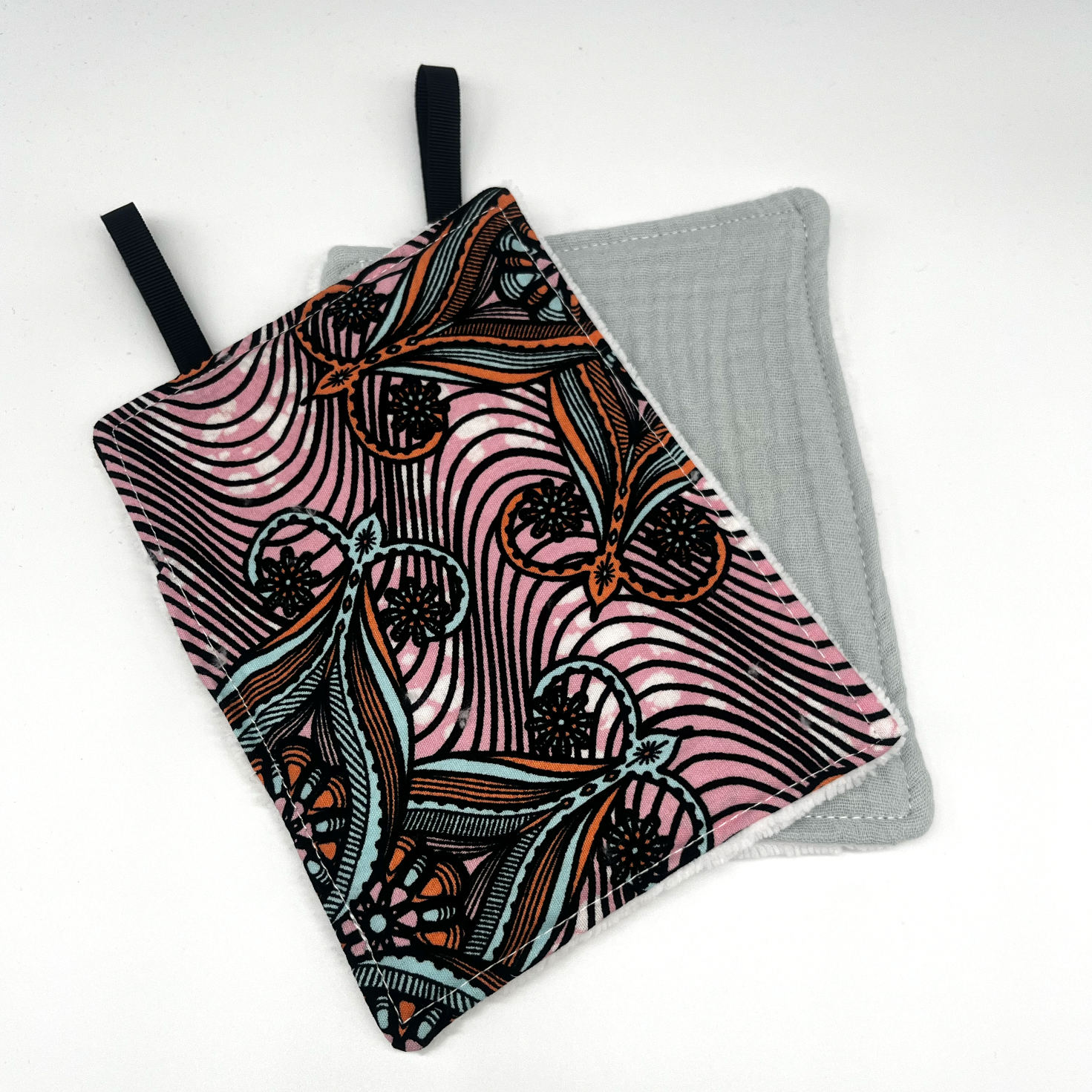 Toallita desmaquillante reutilizable con un estampado lleno de contrastes.